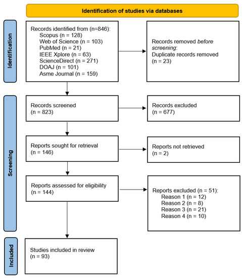 The search yielded a total of 846 articles: Scopus contributed 128, Web of Science 103, PubMed 21, IEEE Xplore 63, ScienceDirect 271, DOAJ 101, and ASME Journal 159. After eliminating 23 duplicate articles, 823 articles remained. Following the application of the exclusion criteria, 93 papers were selected for review. These included 13 articles related to the neck joint, 19 related to the shoulder joint, 22 related to the wrist joint, 9 related to the hip joint, and 30 related to the ankle joint, as illustrated in Figure 1.
