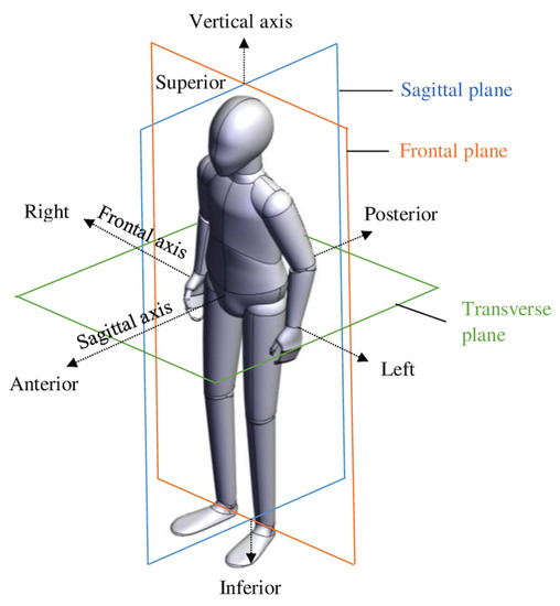 The relationship between the planes, axes, and ranges of motion in human joints is fundamental to understanding how joints function. These concepts are interrelated and play roles in describing and analyzing joint movement. Planes and axes of motion serve as useful tools for describing the directions and orientations of movements in the human body. The three primary planes, sagittal, frontal, and transverse, are associated with the frontal, sagittal, and vertical axes, respectively [34], as illustrated in Figure 2.