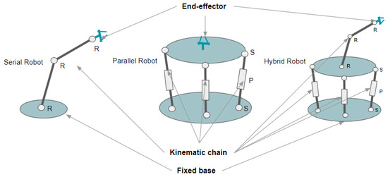 Serial robots have links and joints sequentially connected to maneuver the end-effector in relation to a stationary base. Parallel robots, on the other hand, feature several serial chains that link a movable platform to a fixed base using multiple independent kinematic chains. Hybrid robots integrate features from both, blending closed-chain structures with open-chain systems [21]. These distinctions relate directly to the robots’ architectural design and intrinsic structure, as depicted in Figure 3.