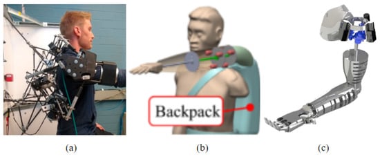 In 2021, Hunt proposed a novel parallel-actuated exoskeleton architecture for rehabilitation. This architecture’s stiffness property could be optimized for specific tasks using a stiffness model and bounded nonlinear multi-objective optimization. Figure 5a shows an exoskeleton designed with a four-bar system in a parallel mechanism, denoted as 4B-SPM. This system allowed individuals to modulate their stiffness attribute to optimize activities, such as augmented lifting or impact absorption for the shoulder [49].