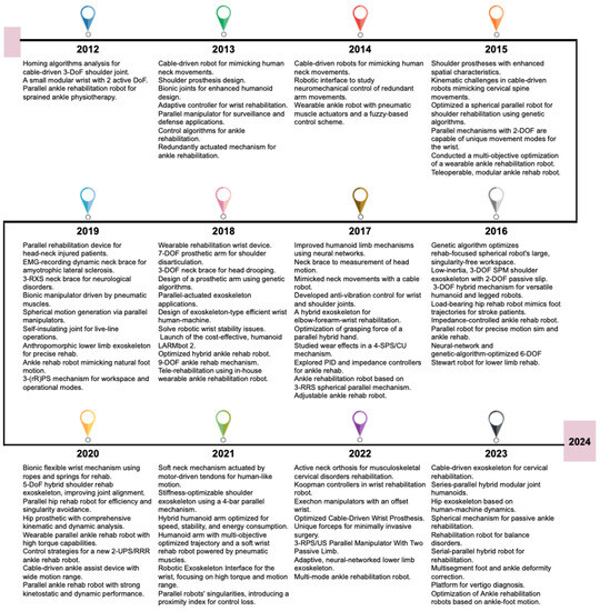 The 93 selected articles were analyzed and categorized by joint type: neck, shoulder, wrist, hip, and ankle. Key aspects such as the year of publication, country of origin, type of rehabilitation targeted by joint, mechanism type, degrees of freedom, types of movement, type of actuator, mathematical models, and simulation tools were considered.