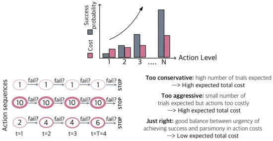 Illustration of the principle behind the mathematical ITS model used by Baraka et al. (2020). Illustration of the underlying assumption that both costs and success probabilities increase with higher action levels. In CARAS, higher action levels correspond to more extensive assistance. Bottom: Trade-off between cost and success probability of an action. If an action was successful at time t, the algorithm receives a reward and terminates the action sequence. If it returns failure, the next action is executed. The maximum number of executed assistances T is predefined (own, based on []).