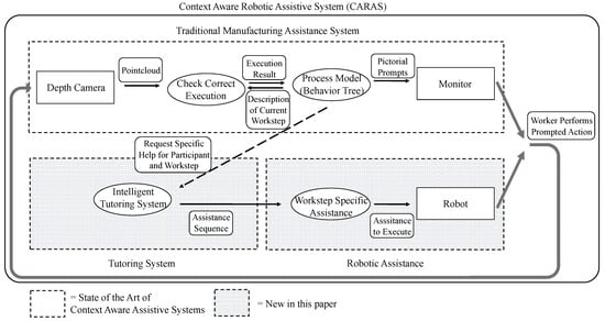 BTs are used to communicate all individual components to the robot, as they allow for situational adaptivity and proved to be promising in human–robot teams []. In the presented research, the BT can either be executed by the human, by the robot, or in a joint action. In addition, the BT allows the CARAS to be modularly expanded and adapted as desired. In the future, the assistance can be extended, and the ITS system can be replaced in a modular way without changing the underlying architecture of the CARAS. In this paper, the current assistance is chosen following the ITS algorithm in []. In the following, more details on the single design and implementation aspects are presented. Figure 3 shows the system diagram of the developed CARAS, how the single parts work together, and how they differ from previous CAAS.