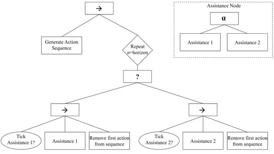 (Left): behavior tree to achieve the same behavior—the execution of a generated action sequence—with the conventional control nodes that is achieved with the assistance node α. On the (top right), the same process is shown but implemented with the assistance node.