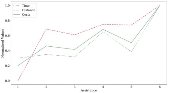 The derived costs of the different assistances, based on the experimentally determined and normalized execution time and distance from the worker. The costs were determined by weighting the distances once and the execution times twice since a long execution time delays the assembly process, reducing human and shop productivity. The six points are connected for better visibility of the behavior.