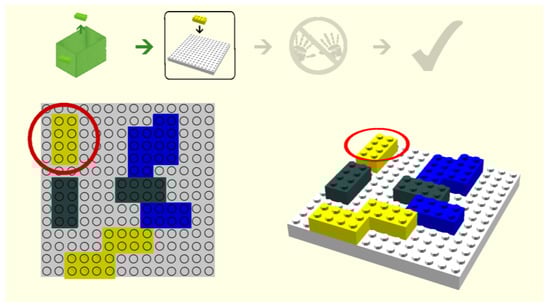 The manipulator was attached to a table 79 cm high, which equates to the height of the working desks of the SW. Moreover, the robot was standing at a displacement of about 90 cm opposite to the participant. That way the robot could easily reach all important locations while at the same time rarely reaching far into the human’s working area. This decision was made for safety reasons, although a close attachment of the manipulator is often perceived as positive by people with disabilities []. The robot’s end effector moved with a velocity of approximately 26 . For safety reasons, the paths of the assistances were predefined and not planned in real time. For this purpose, the assistances were executed in the run-up to the study and repeatedly planned, using the MoveIt [] software. Reasonable paths were saved for the study so that the CARAS could play them back. Reasonable paths were considered to be any paths where no joints rotate more than 180 degrees; during execution, the manipulator is never extended further into the workspace than the end position requires, and the supposed shortest travel path is taken. Only for assistances 5 and 6, where the manipulator indicates the exact position of the Lego brick, the path had to be planned individually. Here, the paths were planned in real time during the study, also with MoveIt. However, the end effector of the robot was restricted to only move with a straight side facing forward from a distance of 30 cm to the participant to avoid contact with the gripper edges. On the opposite side of the desk, a construction was installed, containing a 28 (71.12 cm) digital screen for the prompt. The display showed a top view of the model to be laid as well as a side view. Above these images, the four work steps were displayed so that the worker could get feedback about what the CARAS currently expected him to do. Future steps were grayed out, the current step was circled in black, and steps already completed were marked in green. An example is given in Figure 7.