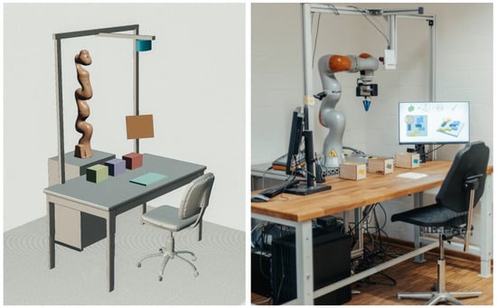 The overall system is developed following the CAASs as those by []. Since this is a first prototype and the focus of this work is on human–robot interaction, the recommended Wizard of Oz method is implemented. In doing so, this work goes one step further and adds a supporting system for state and action recognition to underpin important considerations. This is the use of pure 3D data to grant privacy to the workers using a relatively simple procedure without AI methods. In the future, this will allow workshop group leaders to read new tasks into the system themselves without having to train neural networks. The support system used consists of a top-mounted depth camera that tracks the working steps and verifies the correct task execution, as in [,]. Thus, and also due to ethical safety concerns, the system will not—at this early stage of development—act fully autonomously.