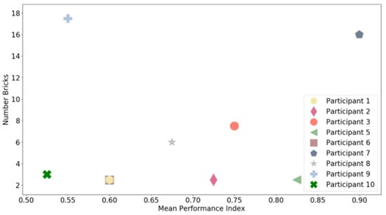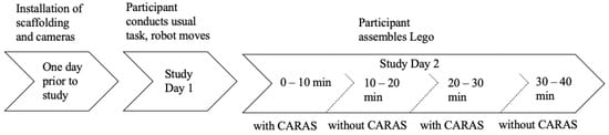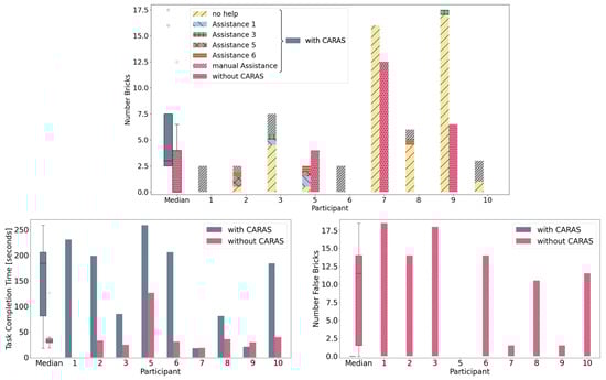 For these reasons, this user study focuses on evaluating whether an Assistive System can support the immediate execution of new tasks using gesture prompts. Investigating this first step is very important because, contrary to expectations, conventional CAAS have led to deterioration, not improvement, in the job performance of people with severe impairments []. A reduced study scope means that in the case of negative study results, it is easier to identify the cause of the worsened performance. This is why the assistances are selected according to a non-learning ITS, as described above, and the study goal is to enable the immediate solution of new tasks, not to increase productivity or achieve long-term learning in the participants. Thus, the focus is on mental assistance rather than purely motor assistance. For this reason, the assistances are limited to gesture prompts since the physical presence of the robot is a promising approach that does not yet exist in this context []. The pick-and-place task under consideration was the placing of Lego bricks following step-by-step instructions. Lego bricks are often used in the literature for abstract pick-and-place tasks since most of the task-completion time is needed for locating the next workpiece and locating the assembly position. Both present task-independent measurements on how well instructions and aids performed and can therefore be transferred to other tasks []. For other application areas, however, other assembly tasks can be selected, with the CARAS adapted accordingly. The study was carried out in an SW in Oldenburg, Germany and is described in the subsequent sections in more detail.