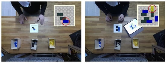 Further research shows that people with severe development disabilities prefer computer-based pictorial prompts over card systems []. Here, displayed instructions, again, can be provided in various ways. Mobile displays can be attached to the tool [] or can be worn by the user. The latter includes wearing it on the chest, head [], and handheld devices such as mobile phones and tablets for providing AR or video feedback [,].