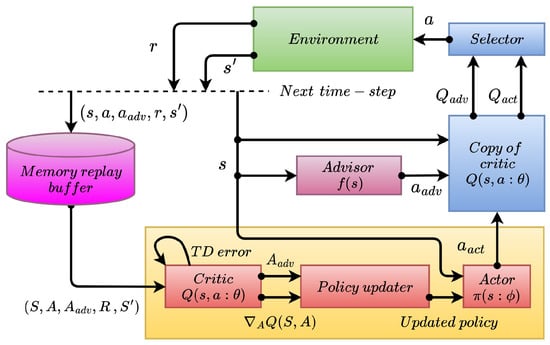 Figure 1. Actor–critic model-based architecture with an advisor. The lowercase symbols s ,   a ,   a a d v ,   r , and s represent a single sample of state, agent’s action, advisor’s action, reward, and next state, respectively, for a given time step. The upper case symbols S ,   A ,   A a d v ,   R , and S represent the batches of the corresponding lowercase symbols selected randomly from the memory replay buffer.