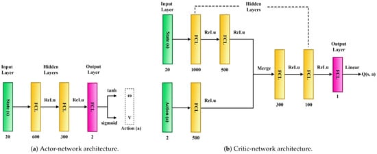 The architecture shown in Figure 1 is developed based on the actor–critic model [51], which comprises two main components called actor and critic. Policy π ( s ) plays the actor’s role and learns to produce the best action for a given state s at a particular time-step t. The critic aims to improve the actor’s behavior considering the rewards received from the environment for the action a played by the agent. The Q-value function Q ( s , a ) plays the critic’s role and gets updated using the temporal difference error [23]. In our implementation, we use neural networks to parameterize the policy and Q-value functions, and we refer to them as “actor-network” π ( s ; ϕ ) and “critic-network” Q ( s , a ; θ ) , respectively ( ϕ and θ represent the trainable parameters of the actor and critic networks, respectively). Additionally, we maintain another two neural networks to stabilize the learning process, similarly to the original DDPG algorithm [15]. They are known as “target actor-network” π T ( s ; ϕ T ) and “target critic-network” Q T ( s , a ; θ T ) , parameterized by ϕ T and θ T , respectively. These target networks are identical to the respective actor and critic networks in terms of architecture but different in terms of parameter updating methods. A soft updating method updates both target networks with the updating rate τ ( 0 < τ 1 ). The network architectures of the actor-network and critic-network used for the experiments are explained in detail in Section 5.3.
