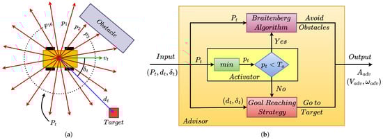 We propose an actor–critic model-based architecture that enables plugging an advisor (see Figure 1) to improve the training efficiency of model-free RL algorithms such as DDPG and TD3. In this approach, any set of rules, existing relationships, or pre-trained policies that map the states to actions can play the advisor role. The advisor used in this approach needs to have some knowledge related to the task, and it is not required to be capable of completing the task successfully. Our experiments use an advisor combining conventional goal-reaching methods with the classical Braitenberg navigation strategy [50] to maneuver a robotic platform to a given goal while avoiding obstacles. The implementation of the advisor and the navigation agent is explicitly described in Section 5.5.
