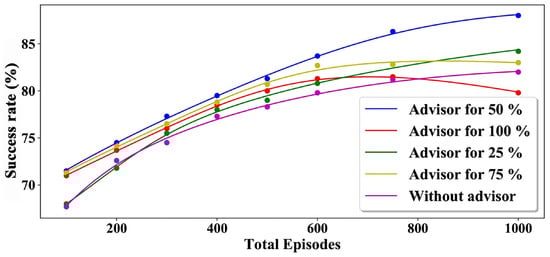 Interactive reinforcement learning (IntRL) is an intriguing domain integrating a trainer to guide or evaluate the behavior of a learning agent [32,33]. The trainer’s advice reinforces the agent’s learning method and molds the exploration strategy, resulting in sample-efficient training by reducing the search spaces of states and actions [34]. Millan-Arias et al. [35] developed an actor–critic RL agent that trained in a disturbed environment while receiving advice, allowing the agent to learn more robust policies. Additionally, Bignold et al. [36] introduced a persistent rule-based approach for IntRL. This method aims to retain and reuse provided knowledge to reduce the interaction between the learner and the trainer by allowing trainers to give general advice for similar states. However, a rule-based advisor may cover only a limited search space of states and actions on complex navigation tasks.