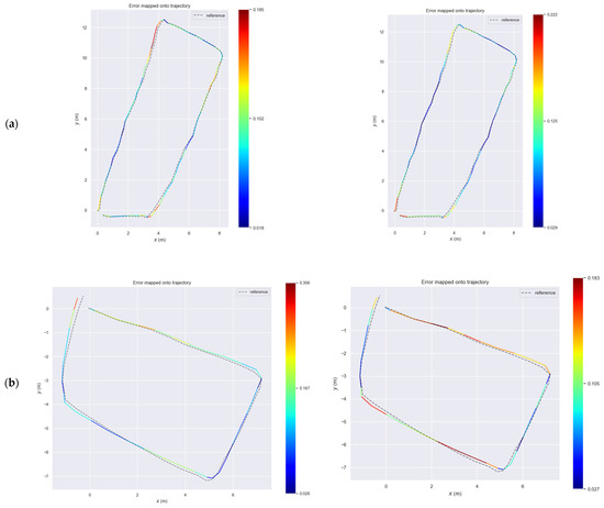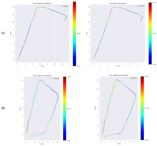 The results of the experiments above are presented in the Table 4, Table 5, Table 6, Table 7 and Table 8. The metrics RMSE (Root-Mean-Squared-Error) and standard deviation with max and min errors are used, calculated using the GNSS-based data as a reference, aiming to determine the SLAM systems’ accuracy. The corresponding qualitative results, with the predicted and GNSS-based trajectories, are presented in Figure 10.