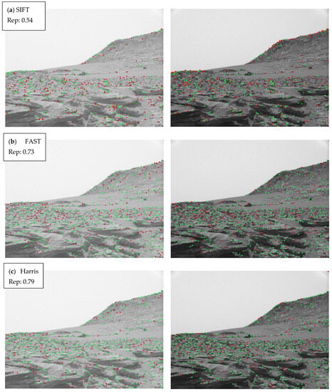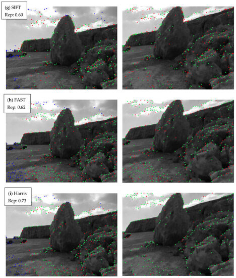 Keypoint locations and repeatability scores for SIFT, FAST, Harris, SuperPoint, original HF-net and HF-net2. Two images from the evaluation dataset are presented: (a–f) scene from Mars testing illumination changes, (g–l) earthly scene testing viewpoint changes. The green dots are points that were detected in both images while the red dots are detected points in one image only. The blue points are not depicted in both images due to different viewpoints.