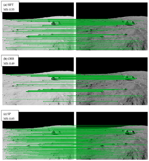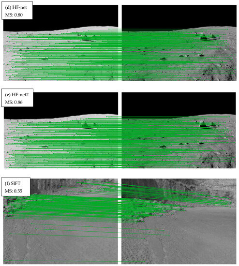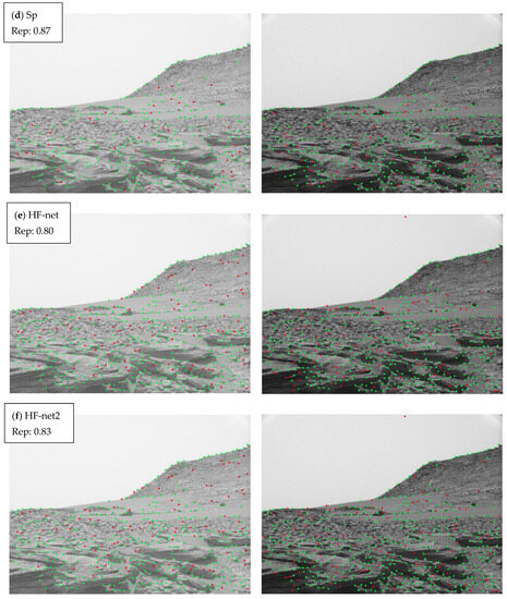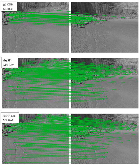 As presented in Figure 12, the green dots extracted from SuperPoint, HF-net2 and HF-net, which are repeatable points in both the (right and left) images of each row, are localized on more meaningful features that better describe the scene than the detected keypoints of SIFT, FAST and Harris. Moreover, the HF-net2 achieves the highest repeatability after the SuperPoint with a value of 0.83, while in terms of viewpoint, HF-net2 and HF-net achieves a repeatability score with a value of 0.75 outperforming SIFT, FAST and Harris. As presented in Figure 13, which visualizes the matching points in two different scenes that suffer from a lack of visual cues, the proposed architecture provides outstanding results (Figure 13e,j) compared with SIFT and ORB and an increased matching score compared with the original HF-net. It is worth noting that in Figure 13a–e, which represents an artificial lunar scene, the proposed architecture outperforms even SuperPoint, which was its teacher during training.
