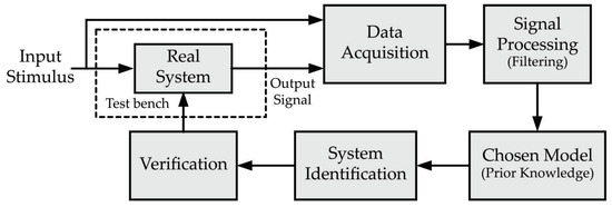 The process that leads to a system identification, utilizing the empirical or gray-box approach, consists of several stages that help to have a better estimation of the system transfer function. The procedure is shown in Figure 1. In the first step, the system input and output signals are acquired through experimentation and filtered to remove noise. Then, if there is prior knowledge about the system being modeled, the structural arrangement representing the system is chosen. In the second stage, signal-processing techniques are used for identifying the parameters or coefficients of the configured transfer function. The third and final step consists of validating the estimated transfer function for the inferred model, by determining the accuracy level reached by this suggested model regarding the true one.