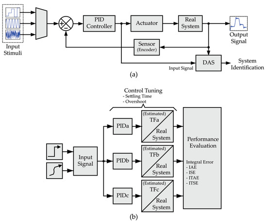 The system identification process, illustrated in Figure 2a, is carried out by applying the input excitation signals: (i) stepped signal, (ii) sinusoidal signal, and (iii) random signal. The PID controller in the closed-loop trajectory generates a gain on the actuator taking as a reference the error signal computed by the difference between the desired system position (input stimulus) and its real one (response measured with the sensor). In this regard, the position is a reliable and widely used reference in the industrial sector, which is commonly measured through an encoder; therefore, this study relied on controlling the system position for the system identification. Hence, the encoder indicates the system’s real response, and a data acquisition system (DAS), embedded into a field programmable gate array (FPGA) [26], is used for carrying out the system identification utilizing the PID controller output and the system’s real response, which are used for deducing three distinct TF (TFa, TFb, TFc) with their corresponding PID controller, as shown in Figure 2b; hence, the controller tuning will be simpler for the TF with the closet behavior to that of the real system [13].