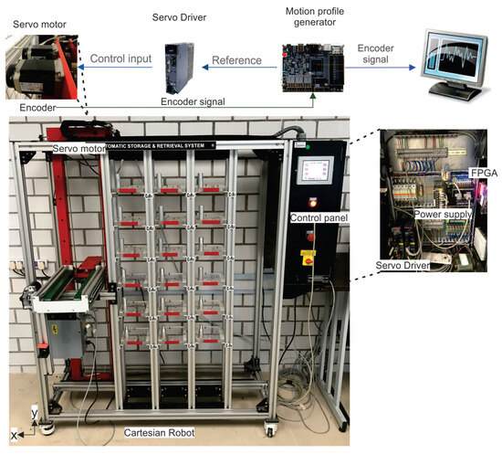 The performance evaluation of the different input stimuli for identifying the appropriate control system was carried out utilizing a Cartesian robot, which is a key element in many different industrial processes that involve high-precision tasks, as shown in Figure 3. The experimental setup consisted of a servomotor (Model GYB41D5-RC2), with a 20-bit serial encoder, a servo driver (Model RYH401F5-VV2), and a Terasic DE0-CV development board with a Cyclone-IV FPGA device.