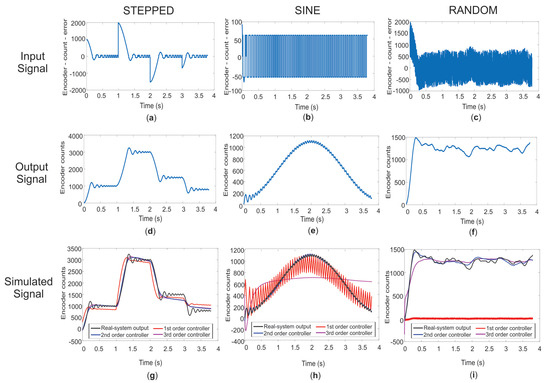 System identification process. (a) Stepped input, (b) sinusoidal input, and (c) random input stimuli. System output signals to the (d) stepped, (e) sinusoidal, and (f) random inputs. System response comparison of the real output signal measured against the computationally obtained responses of the different-order TFs for the (g) stepped, (h) sinusoidal, and (i) random input signals.