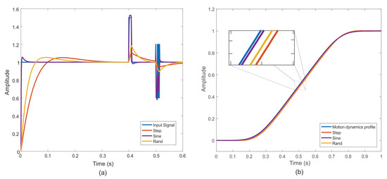 The tuning process was performed utilizing the root locus method described on [28]; hence, the desired outcome was the same for all designs, maintaining a settling time of 1 s and an overshoot of 5%. A PID controller tuning was carried out for each system TF as described in (6)–(8), for the stepped, sinusoidal, and random stimuli, respectively. Figure 5a shows the desired behavior of the system and the obtained response for each different controller tuning. From this figure, it can be observed that all responses maintained a 5% overshoot, but their settling time changed depending on the PID controller tuning being utilized for the estimated TF.
