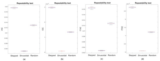 Repeatability tests for the three transfer functions identified through the stepped, sinusoidal, and random input stimuli, (a) IAE, (b) ISE, (c) ITAE, and (d) ITSE evaluation criteria.