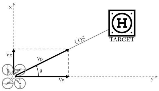 Proportional guidance maintains the constant angle () between the line of sight (LOS) and the target, for which the yaw rotation speed is proportional to the rotation speed of the angle between the LOS and the UAV [30]. In Figure 1, the geometry of this type of guidance can be appreciated, where the variable Vp, which is the approach velocity, is introduced with respect to the local axes of the UAV.