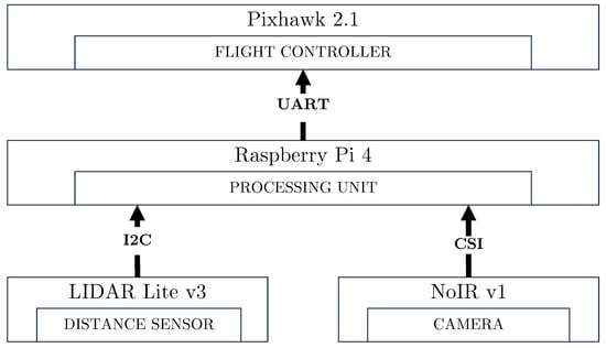 Considering the conditions in which monitoring missions in remote areas are conducted, it is essential to minimize the energy consumption so that it does not have significant impact on the aircraft’s autonomy and it can cover larger areas of land. The developed prototype supports landing maneuvers and obstacle evasion, taking into account that the LOAS must be programmed on a low-cost computational platform, and their hardware must be lightweight enough not to affect the UAV’s performance. Figure 4 shows the general connection diagram between the flight controller and the auxiliary prototype. The auxiliary devices that enable the execution of the LOAS represent a load of 122 g, which is light enough compared to the available payload.