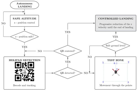 Initially, communication is established via MAVLink messages and the flight status is checked. Only when it is detected that the landing has started, the guidance process begins. This algorithm has four processes, shown in Figure 5, structured according to the logic of the algorithm. This is an ordered sequence of processes based on the scenario (whether a helipad is present or not) that aims to execute the final process, concluding the landing maneuver, and achieving a safe descent in a secure zone.
