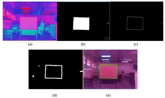 (a) Image in the HSV system. (b) Result of the color detector. (c) Result of the canny edge detector. (d) Edge dilatation. (e) Final result of the obstacle detector.