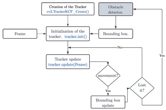 To initialize the tracker, the bounding box determined in the previous section is used, along with the tracker.init() command from the OpenCV library. This command takes as input the data of the frame in which the object was detected, along with the bounding box that surrounds it. Once the tracker is initialized, the next step is to track the object using the tracker.update() command from OpenCV. This command is responsible for updating the value of the bounding box based on the new position of the pixels inside it [42]. Figure 8 shows the implemented object tracker control algorithm, which only terminates when the tracked object leaves the drone’s field of view or if the tracker receives a false positive.