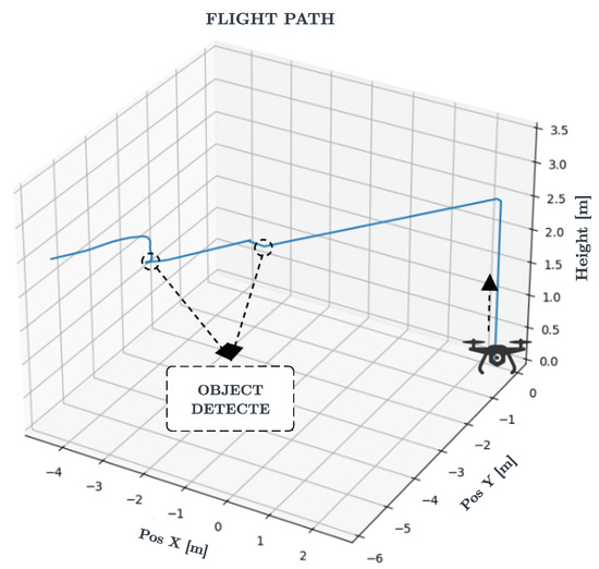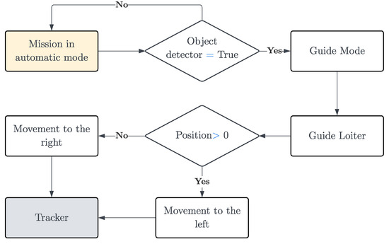 One of the objectives of the avoidance system is to be completely autonomous during the execution of the mission preprogrammed in the mission planner, since the flight will be performed beyond the point of view. For this reason, the flight mode will always remain automatic, and only when an object is detected at less than 3 [m] will the flight mode change from automatic to guided. The drone will then perform a guided loiter, moving to the right or left as described in the previous section, until the object leaves the camera’s field of view. Once this is complete, the drone will resume the flight mission until it finishes or detects another obstacle that may cause a collision.