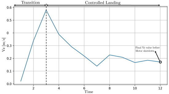 Equation (2) represents a velocity ramp calculated following the basic linear relation (y = mx + b), in which constants (m and b) are determined by the initial and final height points measured using the distance sensor, which is determined by the initial and final height points measured using the distance sensor, along with a pre-defined landing speed set in the flight controller’s parameters.