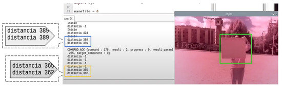 Figure 13 shows the results obtained by the obstacle detector, where one can see in a blue box the value of the distance at which the object is detected, and in yellow the value of the distance at which the UAV stops.