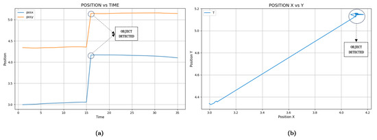 Figure 14a illustrates the variation of the drone’s position over time. It can be observed that the drone starts by maintaining its position and then moves forward until it detects an obstacle at t = 16. Once the obstacle is detected, the drone stops and waits for further instructions. The same maneuver can be observed from a different perspective in Figure 14b.