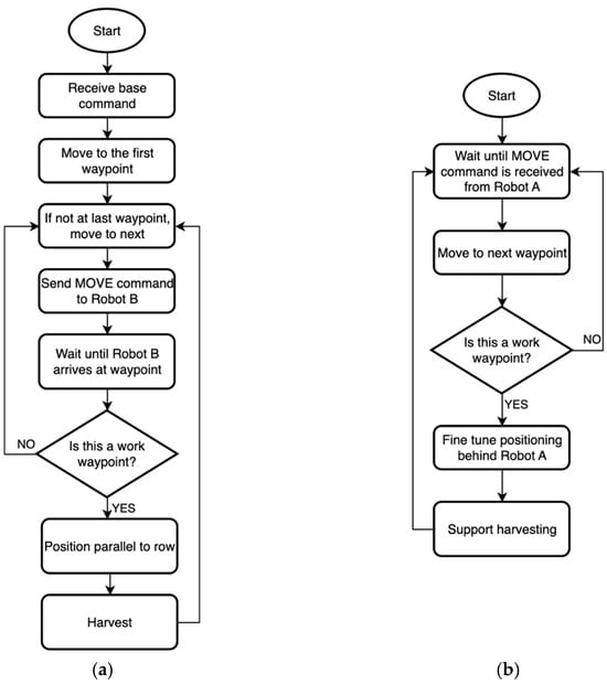 In addition to their ability to move toward prescribed locations, the robots are able to navigate in a coordinated manner inside the vineyard. The preliminary coordination algorithm was presented in [42]. In the leader–follower architecture adopted here, the expert robot is visiting the waypoints produced by the software of the base station and received at the beginning of the mission. At each waypoint, the expert robot transmits a command to the helper robot to move in such a way so that the helper robot is always a waypoint behind. In other words, the expert robot instructs the helper robot to always occupy the expert robot’s previous position. The expert robot waits until the helper robot reaches that position and is notified when this happens. In the case where the waypoint reached by the expert robot is designated as a harvesting position, the helper robot is instructed to prepare to support harvesting. Preparing for harvesting support means that the helper robot is required to first roughly approach the expert robot and then fine-tune its position so that it rests at a preset distance of 40 cm and also assumes the same orientation as the expert robot, using visual cues as is described later in Section 2.6. At this distance, the UR10e manipulator on the helper robot can reach the expert with ease and is able to assume any poses necessary to successfully carry out cooperative harvesting. The navigation algorithms for the coordination of the two robots are summarized in the flowcharts of Figure 2 below.