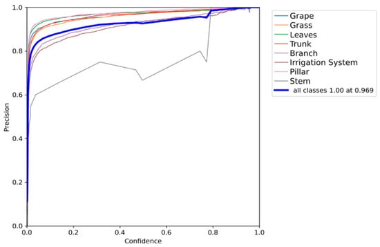 To train the model, a dataset that comprised 10,000 photos was collected. These photos represented various objects, such as grapes, trunk, and ripening phases of the vineyard. Two methods were used to capture the images: (a) a DJI Mavic Mini Drone, which flew between the rows of the vineyard, and (b) a handheld camera operated by an individual walking through the vineyard rows. To optimize the annotation process, the software “Label Studio” was used because it allows image annotation by multiple users working in parallel. The annotation process involved the participation of 70 contributors, who collectively annotated 3500 images using rectangular boxes. The resulting dataset consisted of eight predefined classes that the model had to recognize: Grape, Leaves, Irrigation System, Branches, Grass, Pillar, Stem, and finally the Trunk. However, for the harvesting task, only two classes, namely Grape and Stem, are considered. For the training process, the YOLO v7 E6E model was employed. The images collected from the various sources were resized to 1280 × 724 pixels and training was conducted using four Type A100 GPU cards. Τhe dataset was divided into a training subset comprising 75% of the data, and the testing subset consisted of the remaining 25%. Τhe training process spanned 2500 epochs, and the duration was approximately 10 days. Figure 3 shows the resulting precision for all classes after training.