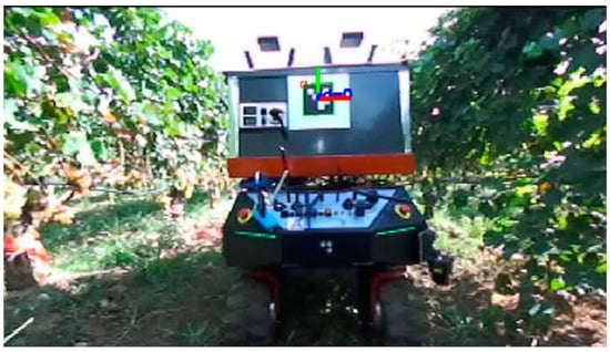 At the beginning of the experiment, the robots were positioned at an initial location, and adequate time was allowed (approximately 10 min) until an accurate enough GPS location was retrieved. During this initialization time, the vision model was loaded. After that, the experiment was initiated. The robots were observed to follow the intended path by visiting the prescribed waypoints sequentially, with the intended coordinated navigation behavior. At each waypoint, the expert robot waited for the helper robot to reach the expert robot’s previous waypoint. When this happened, the expert robot proceeded to the next waypoint. As anticipated, the paths followed by both robots between any two waypoints were not straight but were executed as the result of the planning process occurring under the TEB path planning algorithm described above. Figure 8 shows the two robots within a vineyard row while coordinating their motions.