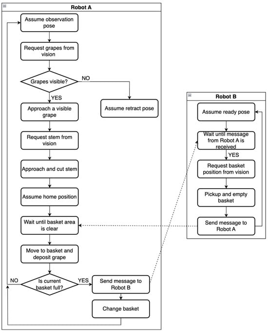 During the time that the helper robot handles the temporary basket, the expert robot is free to proceed with cutting another grape if one is detected, but it cannot deposit it to the other temporary basket until the helper robot signals that the basket area is clear. This reduces the time that the expert robot is idle and allows parallel but safe operation. The number of grapes that each basket can hold can be determined in advance, based on an estimation of the average size of the grapes of the target grape variety. This value would depend on the target grape variety. The harvesting process continues until the expert robot’s manipulator assumes the observation pose and does not detect any grapes. At this time, if there are grapes inside a temporary basket, even if the basket is not full, they are picked up by the helper robot, and when this process is completed, the robots retract their manipulators and resume their coordinated navigation toward the next waypoint. The full cooperative harvesting algorithm for both robots is illustrated in Figure 6.