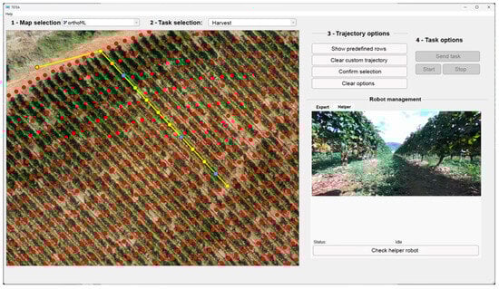 In order to plan the path that the robots are to follow during the harvesting task, the user must first select the map of the target vineyard. Vineyard maps are produced in advance using images taken from an aerial drone, deployed to conduct a comprehensive aerial survey of a vineyard. These high-resolution images are then processed in such a way that the maps contain location information and features such as the vineyard rows and other obstacles. This processing is carried out in Agisoft Metashape, a software application specifically designed for processing aerial imagery. The software generates three map types: an orthomosaic, a high-resolution composite image of the vineyard, and a binary image. The binary image, in particular, is generated by extracting and classifying the Digital Point Cloud (DPC). This classification results in the creation of a Dense Elevation Model (DEM) comprising various classes of objects and ground points. By subtracting the DEM of ground points from the overall DEM, a DEM of differences (DDM) is obtained. This DDM serves to filter out the crop heights while excluding ground-related information. As a result, a binary DDM is produced, which is then used in the generation of the navigation path, in conjunction with the orthomosaic image. More specifically, the generation of the navigation path consists of three steps: (1) the preprocessing step, which provides the field images in an appropriate format, (2) the crop row detection algorithm which uses the Hough transform to detect the angle of the crop lines, and (3) the navigation mapping process to define the final route for the robots [45]. In the process of developing the navigation system for in-row waypoints, users have the flexibility to choose the desired distance between waypoints and save this configuration for future use. Additionally, the waypoints for turns between rows are determined by identifying the peaks of the rows, which are then used as circular points for navigation calculations. The user is able to select different areas of the vineyard in which the robots are to operate, and the corresponding waypoints for the entire mission (from an initial location to an end location) are generated.