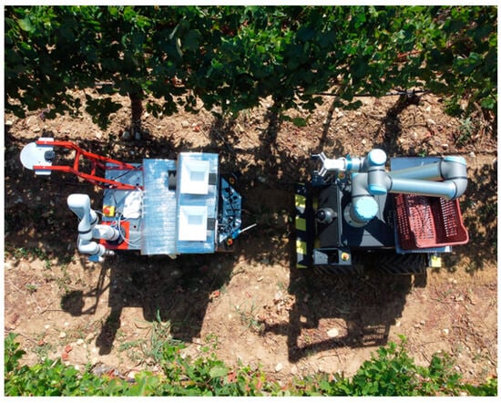 The use of robots in agriculture has been proposed as a solution to various challenges facing the agricultural industry including increasing farming costs, labor shortages, increasing demands for food production, and the need for environmentally friendly farming solutions [1,2,3,4,5,6]. The potential benefits of employing robots in agriculture have driven research for several years and have resulted in experimental as well as commercially available robotic platforms. The implementation of operational agricultural robots involves an array of supporting technologies including localization (in a greenhouse or outdoor environments), navigation (within crop rows), vision (target plant recognition, e.g., for banana detection [7], pomegranate identification [8], grape cluster detection [9,10] or plant detection for weed control [11]), robotic manipulator control, and power management to name a few. Vision in particular is considered essential for fully autonomous operation. The proposed solutions are usually domain-specific instead of being comprehensive as unifying solutions. Examples of the application of agricultural robots can be found in various crops and for various associated tasks such as corn fertilization [12], weed control in lettuce and broccoli [11], or harvesting strawberries [13]. Automated sensing solutions for viticultural and vinicultural tasks have also been pursued in mapping, monitoring, and management [14,15], including using robots in typical tasks performed by humans, such as pruning grapevines [16], harvesting [17], spraying [18], monitoring [19,20], maturity estimation [21], and weeding [22].
