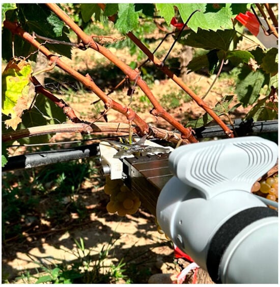 In terms of the actual harvesting of the grapes, it was observed that the preset observation pose was appropriate, set at the approximate height where grape clusters are present. The vision module recognized the grape clusters unobscured by leaves reliably and, using the depth information of the camera, was able to direct the end effector of the robotic arm to approach each grape cluster. All detected grape clusters were eligible for harvesting. However, the stem recognition, which takes place after the initial approach of the arm to the grape cluster, was not as reliable. This is due to the fact that for many of the recognized grape clusters, the stem was either fully or partially occluded by the individual grapes or by leaves. Occlusions of this kind hindered object recognition and thus the location information for stem approach and cutting was unavailable to the arm. When stem location information was missing, the arm was directed to assume the observation pose and search for the next grape cluster and repeat the process. A failure to detect the stem adds a delay of approximately 10 s in total to the process. This time includes a grape cluster arm approach, a five-second timeout for unsuccessful stem detection, and arm retraction. Another reason for unreliable stem recognition was image overexposure when the grape cluster was directly exposed to the sun, especially in cases where the visible stem was very short. Figure 11 shows the robotic arm cutting a recognized stem.