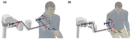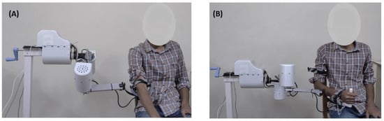 Human–robot closed-loop kinematic chain for single-joint training of (A) shoulder and (B) elbow joints.