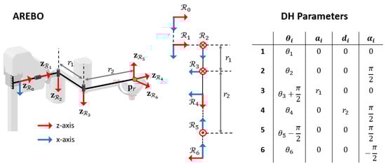 AREBO was designed to have a six DOF kinematic chain (Figure 2) to provide flexibility in attaching the arm to the robot. The three proximal DOFs are actuated, which can control the 3D position of the robot’s endpoint, while the three distal DOFs of the robot are unactuated, forming a spherical joint centered around the robot’s endpoint, which forms the robot’s unactuated segment (Figure 2). Let be the base frame of the robot that is fixed to the earth and let represent the local reference frames attached to each DOF of the robot. AREBO has six generalized coordinates corresponding to its six DOF, . Figure 2 depicts AREBO’s kinematic chain along with its Denavit–Hartenberg (DH) parameters for the transformation between subsequent local reference frames. The origin of the reference frame is referred to as the robot’s endpoint, which is a function of the first three generalized coordinates () and the link lengths (). The reference frame’s orientation depends on all six generalized coordinates . Refer to the Supplementary Material for the detailed forward and inverse kinematics of the robot.