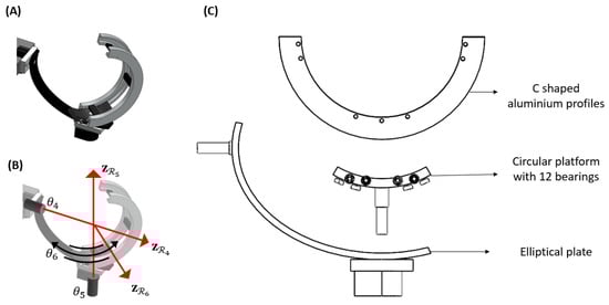 The three proximal joints with the motor and torque sensor assembly were interconnected by two aluminium links and three custom-designed flange couplings with keyways. The tapped hole and key on the motor shaft were utilized to prevent relative motion between the coupling and actuator. The couplings and the links were fabricated with IS 2062 plain carbon steel and 6061 aluminium alloy, respectively. The 3D model of the distal spherical joint formed by the robot’s three unactuated DOFs is shown in Figure 5. An elliptical plate with a shaft at one end connects the cuff with the rest of the robot (Figure 5C). The dimensions of the ellipse were calculated to allow a range of motion of 90 degrees for . The 5th joint () was formed by a circular segment placed over a shaft. Twelve ball bearings (four on each side and four at the bottom) were strategically placed to clone the behavior of a hinge joint at . Two C-shaped semi-circular aluminium profiles held together by three spacers formed the sixth DOF.