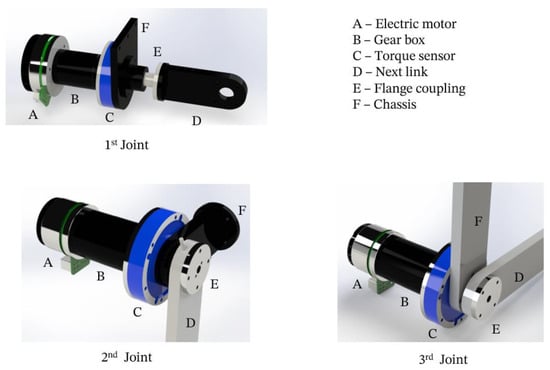 Each actuated joint consists of a reaction-type joint torque sensor that is sandwiched between the actuator’s body and the proximal segment of the joint (Figure 6); the torque sensors are used to implement an outer torque control loop around each joint. The rotary encoder on each brushless DC motor senses the joint position of the three actuated DOFs ; two additional rotary encoders were fitted to sense and These encoders allow us to compute and the orientation of () since we do not measure (Figure 2). The specifications of the actuators and sensors are given in Table 2.