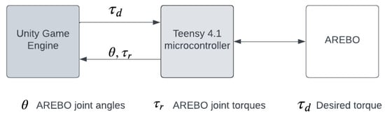 A Teensy 4.1 (PJRC.com, LLC, USA) microcontroller performs the low-level hardware interfacing AREBO’s actuators and sensors. The three actuators are controlled through individual pulse width modulation (PWM) lines from the microcontroller to the ESCON 70/10 motor controllers operating in the current control mode. The five encoders are connected to ten digital lines (channel A and channel B for each encoder). Each torque sensor is connected to an HX711 (dual-channel 24-bit precision A/D weight pressure sensor) load cell amplifier, which connects to the microcontroller through two digital lines (two-wire interface). The firmware on the microcontroller runs at 200 Hz, with each iteration of the firmware code performing sensor reading, control law execution, and data communication with the PC. The different components of the firmware/software system interfacing the robot are depicted in Figure 7.