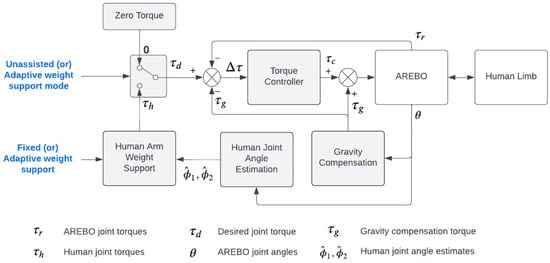 - Human arm weight support module: This module estimates the torque required to provide a given level of weight support to the arm based on the estimate of the arm’s joint angles.