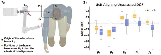Figure 11B illustrates the variation of the threeactuated DOFs at the five different locations of SJM (Figure 11A), while the SJM performed the same movement. One-way ANOVA on and revealed a statistically significant difference for both of the angles due to the different locations of the SJM (For ; for ). This shows that AREBO’s unactuated segment allows the robot to automatically align to the different orientations of the robot; the absence of this feature will result in undesirable forces on the human limb when it is connected to the robot. Post-hoc analysis with Bonferroni correction indicated that all pairwise comparisons were statistically significant.