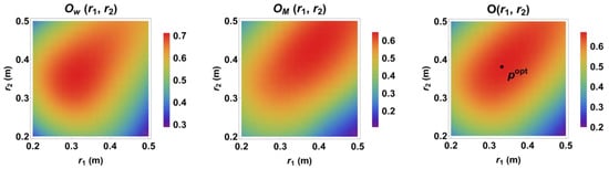 Heat maps for the variation of objective function O () and workspace ; manipulability components as a function of the robot link lengths. is the global maximum of the objective function, and the corresponding ( are the optimum link lengths.
